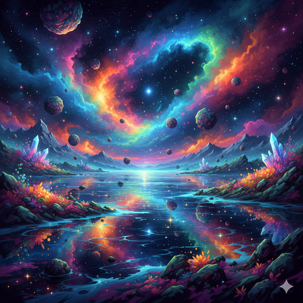 - A surreal galaxy landscape where oceans blend with outer space, glowing stars reflecting on water, digital painting, vivid neon colors