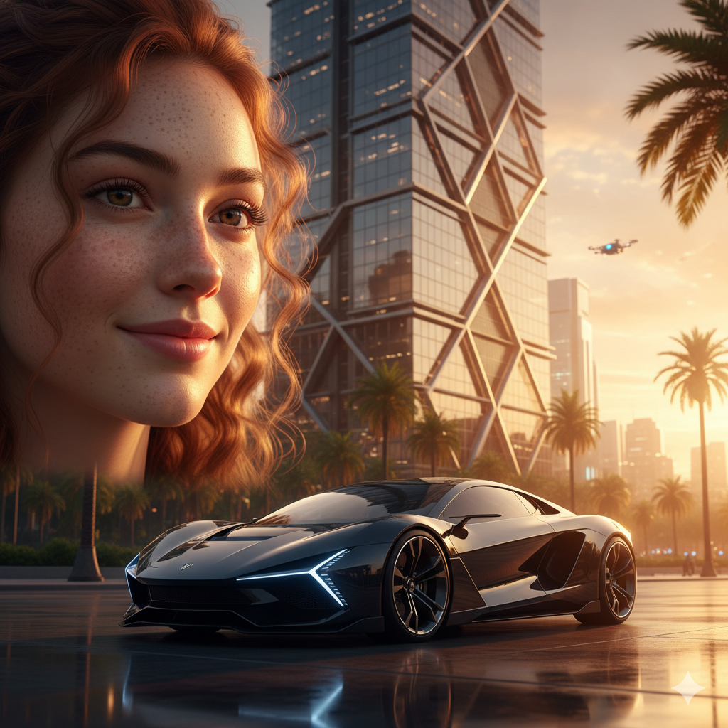 - A luxury sports car parked in front of a futuristic skyscraper, golden hour lighting, cinematic ultra-realistic style